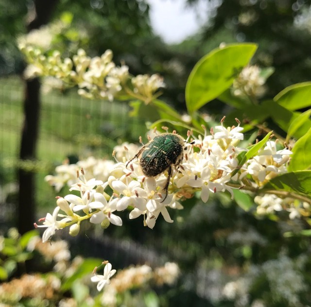 写真のハナムグリを筆頭に、ミツバチ、アブ、チョウ、沢山の種類の昆虫たちがその蜜を求めて集まってきていて、眺めているだけで実に楽しい。
