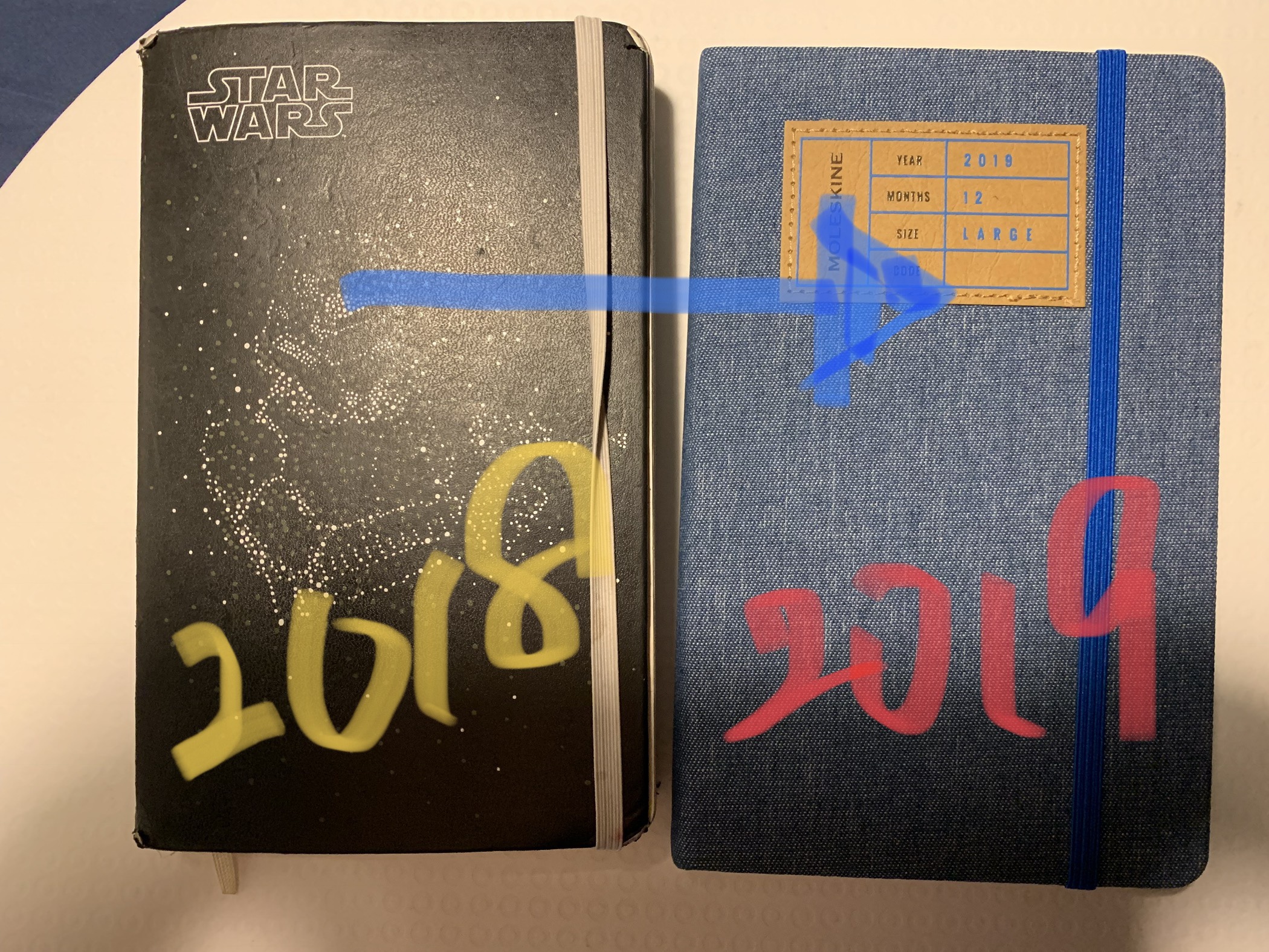 左のスターウォーズ君は、一年持ち歩いたんでかなりくたびれました。おつかれさま。あ、そう、僕はいつでもどこでも書きたいので、いつも持ち歩きます。だから、日記帳も大変です。左のデニム調のやつが2019年版。1日1ページ書いていくタイプです。まだ、キレイなもんですなあ。どんな風にくたびれていくのか今から楽しみです。