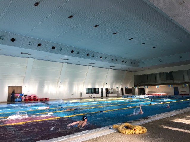 良いプールだなあ。でも暑い。室内のプールサイドでもキツイよ。
